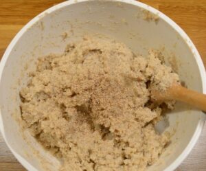 - Mešanje sa ostalim sastojcima: U velikoj posudi sjedinite samlevenu pšenicu, kristal šećer, vanilin šećer i mlevene orahe. Po želji dodajte i narendani muškatni oraščić. Mešajte dok se sve ne sjedini u homogenu masu.
